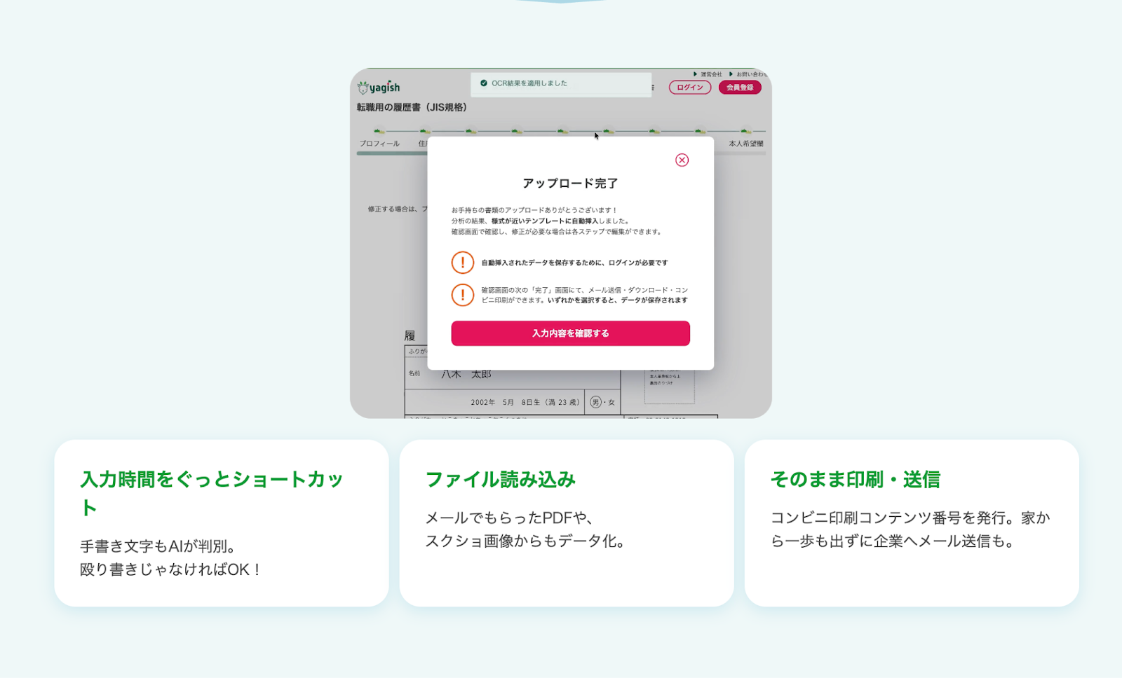 今回ヤギッシュに追加された機能は、お手持ちの履歴書や職務経歴書をスマホのカメラで撮影(または画像のアップロード)するだけで、書かれている文字を自動で読み取ってくれるものです。